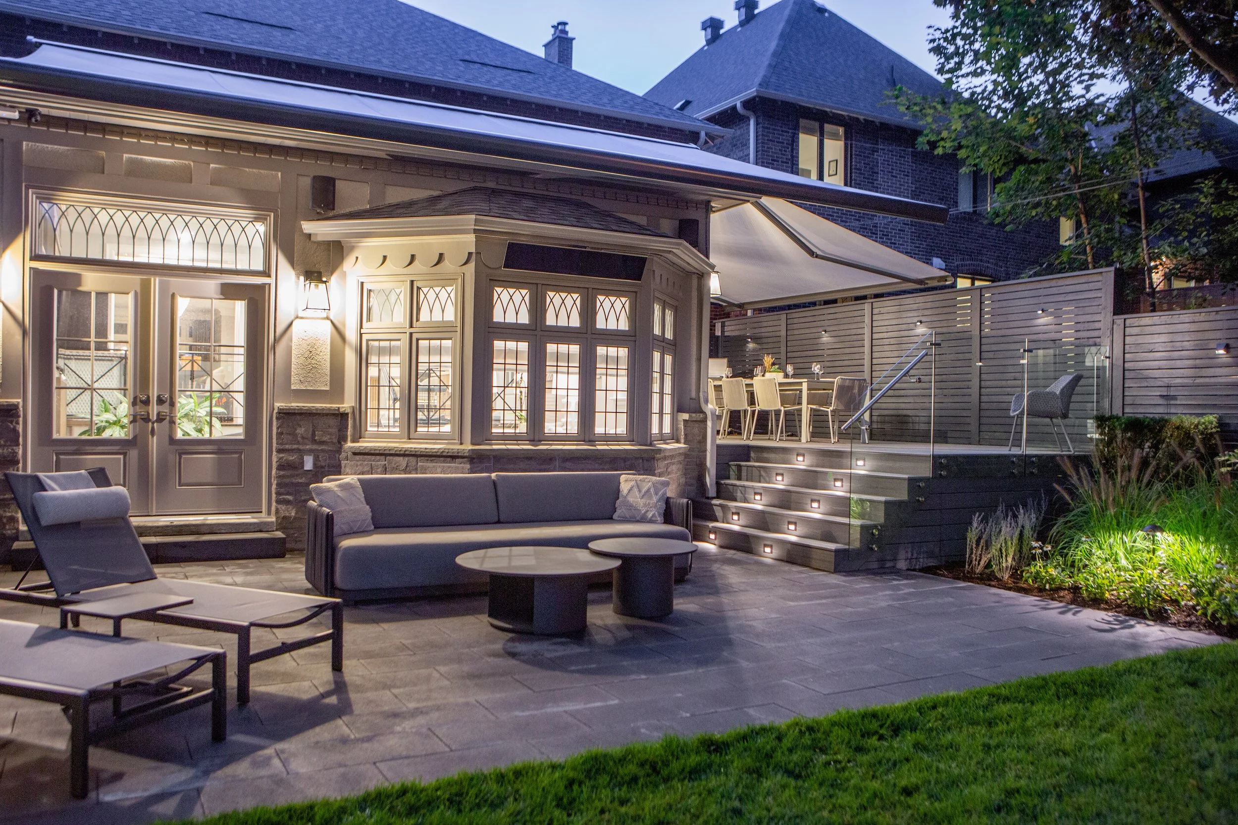 Adding contemporary features to a traditional house can be challenging. This was achieved by using materials like narrow brick in a herringbone pattern, glass railings and weathered steel garden walls. The backyard features retractable awnings, infrared patio heaters and an electric cedar sauna.